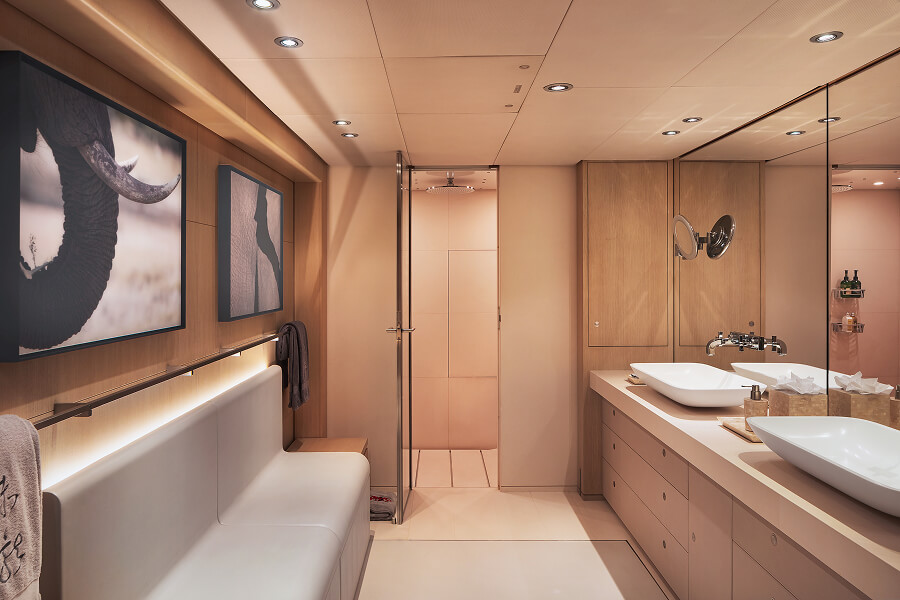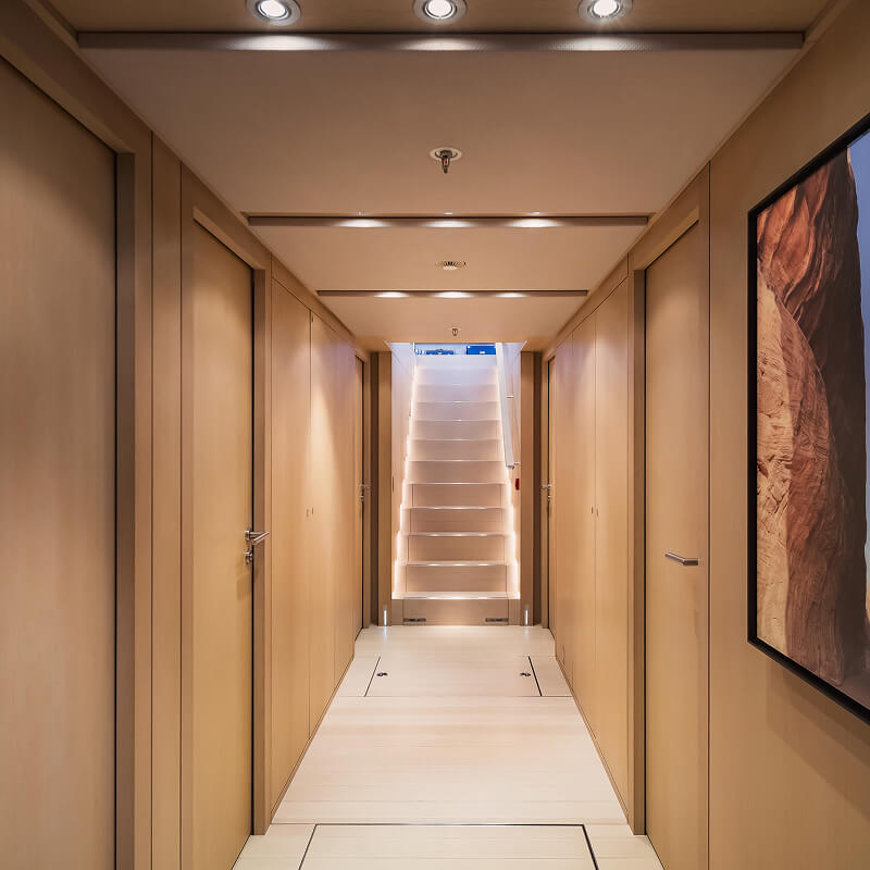 Every space on board has been conceived with intention. From the main salon to the guest cabins, the balance between elegance and warmth is constant. Art pieces, bespoke furnishings and panoramic windows ensure that the inside of Red Dragon is as remarkable as the world beyond her hull.